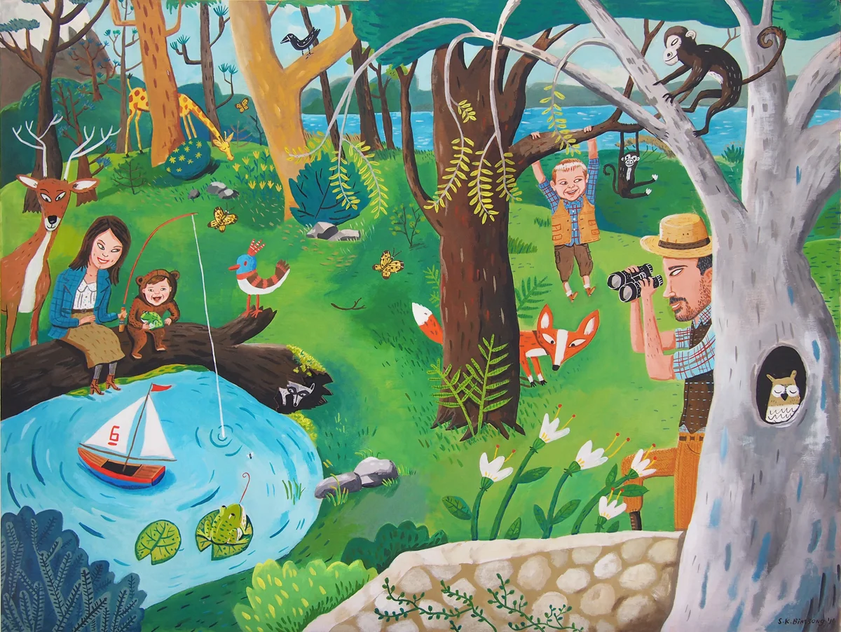 A bit late in posting this, but I've now completed this commissioned piece. I don't really have a name for it, but have been calling it "Mo & Co." It's gouache and acrylic on wood panel, 18" x 24" and has now gone to it's home in Oregon, where it will be a birthday present for a very young man, here seen sitting on a log petting a frog. Maureen, the client (left) was a pleasure to work with. Truly a fun project!