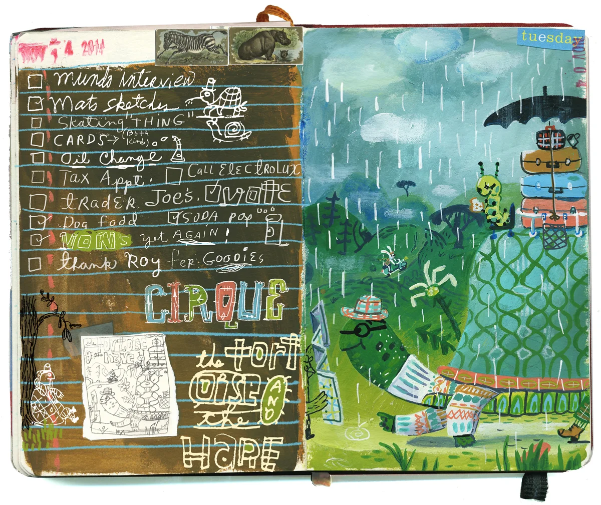 This week in MATS class, we're doing children's picture books. The assignment was illustrating the cover or a spread of Aesop's "The Tortoise and the Hare" fable. I saw the tortoise as being a very organized and positive fellow, who would plan out his journey to the "T". I love painting rain scenes, so I threw that in because I wanted to make my painting feel really atmospheric.