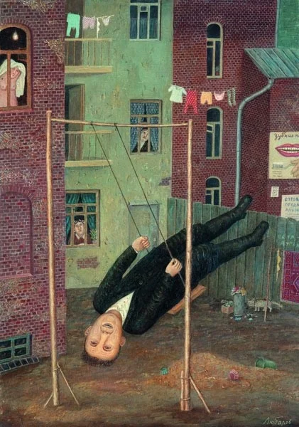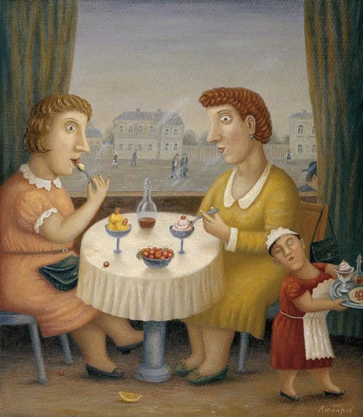 I love the paintings of this Russian artist. The muted palette, the Botero-esque figures & the wonderful details.
