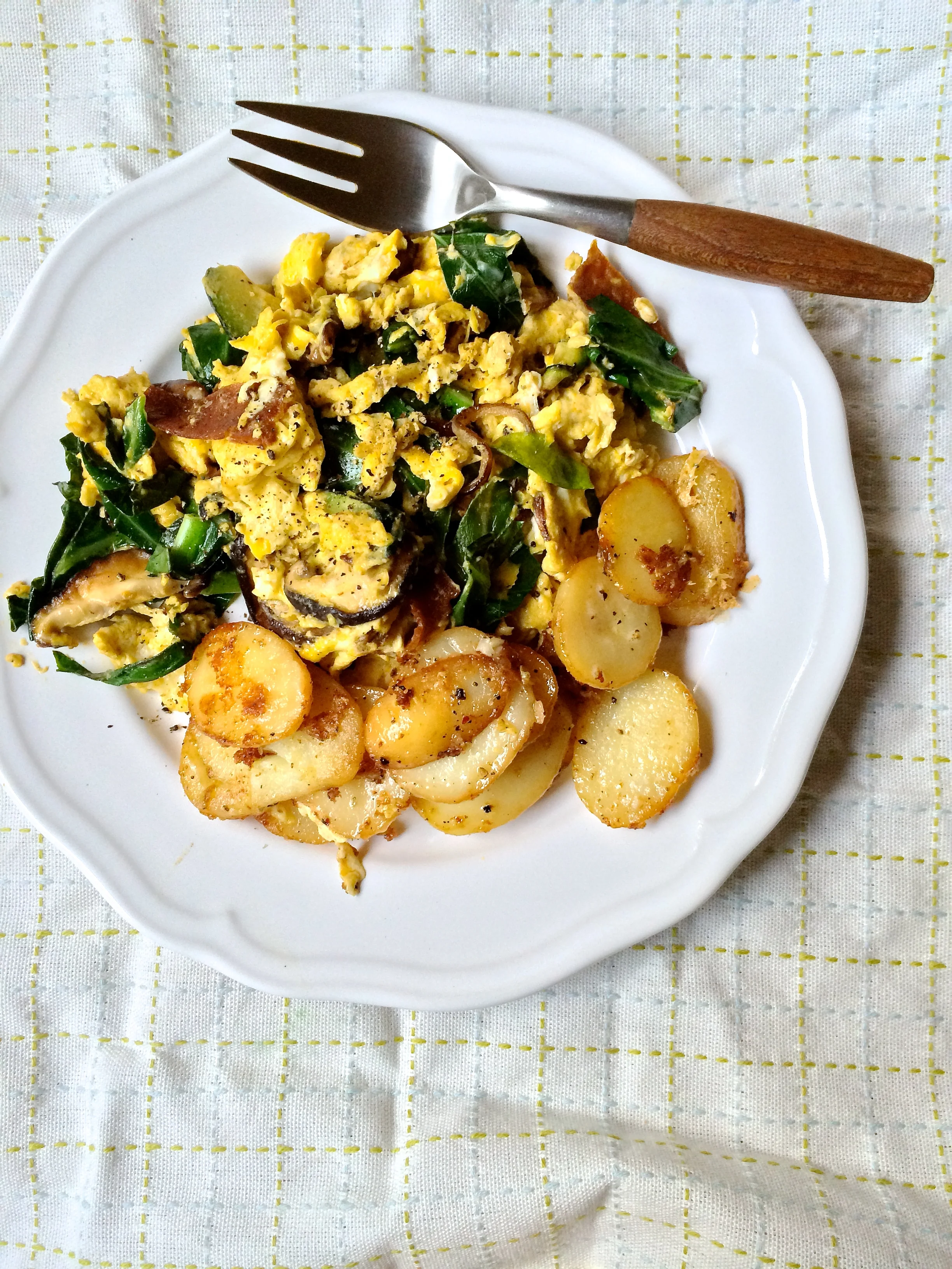 Scrambled fresh eggs with collard greens, seitan bacon and shiitake mushrooms and a side of garlic parmesan potatoes.