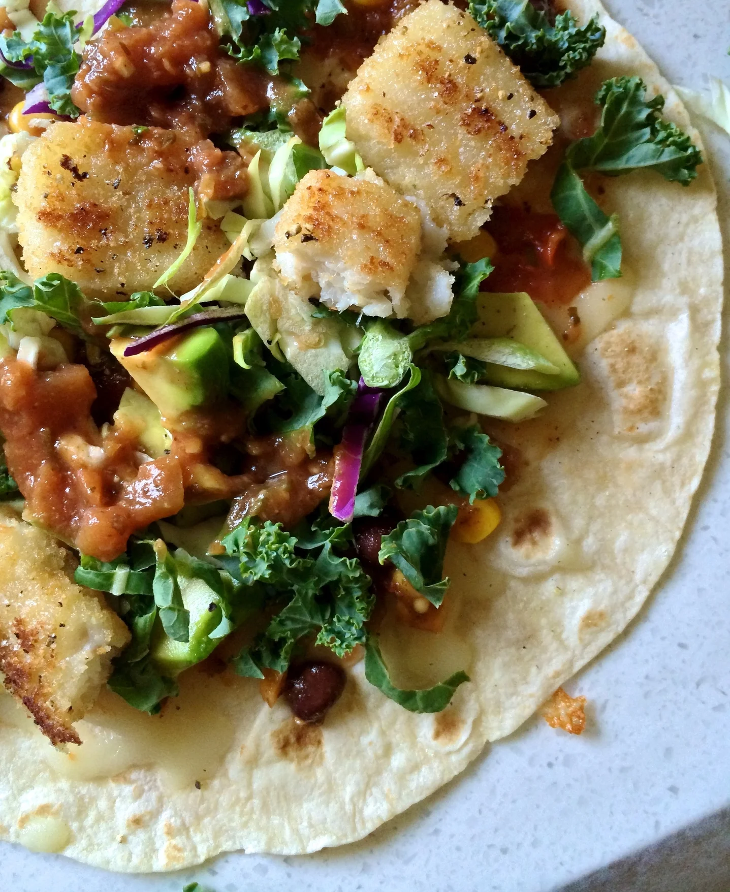 I'm loving tacos these days. They can be an event with homemade salsa and other fillings, or a super-quick lunch thrown together with packaged ingredients, such as this tasty one: Light fish sticks, kale, shaved brussels sprouts, cabbage, corn & black bean salsa, garlic salsa, avocado, a touch of cheese.