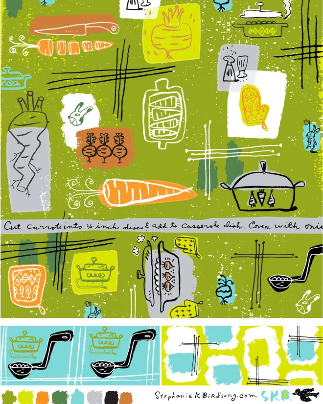The assignment: vintage style kitchen bolt fabric design using the theme of root vegetables and casserole dishes.