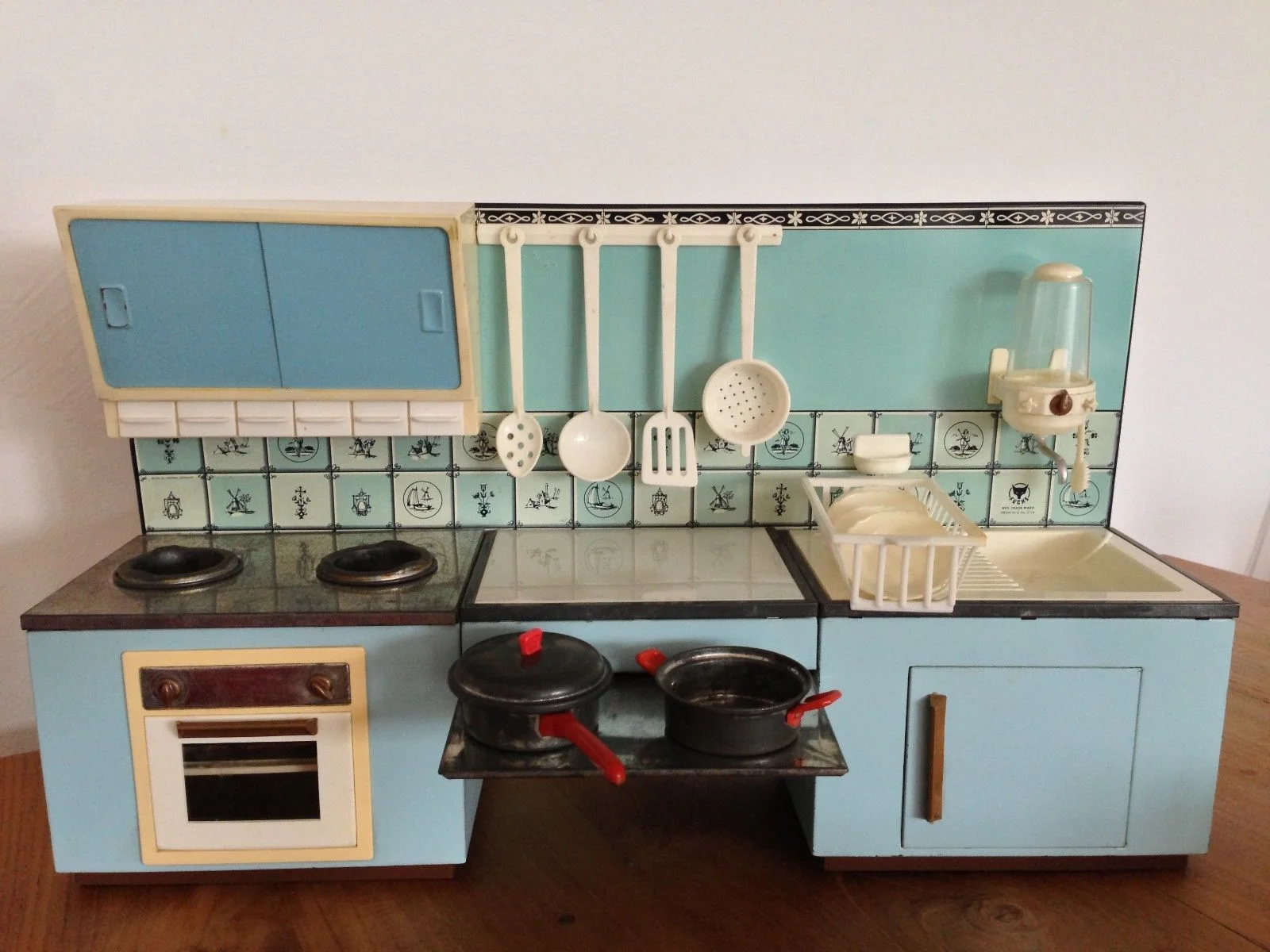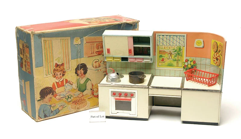 Battery-operated tin kitchen. This one is a little beaten up, but when you turn the tap on, water flows and the gas burner "fires" up. via ebay