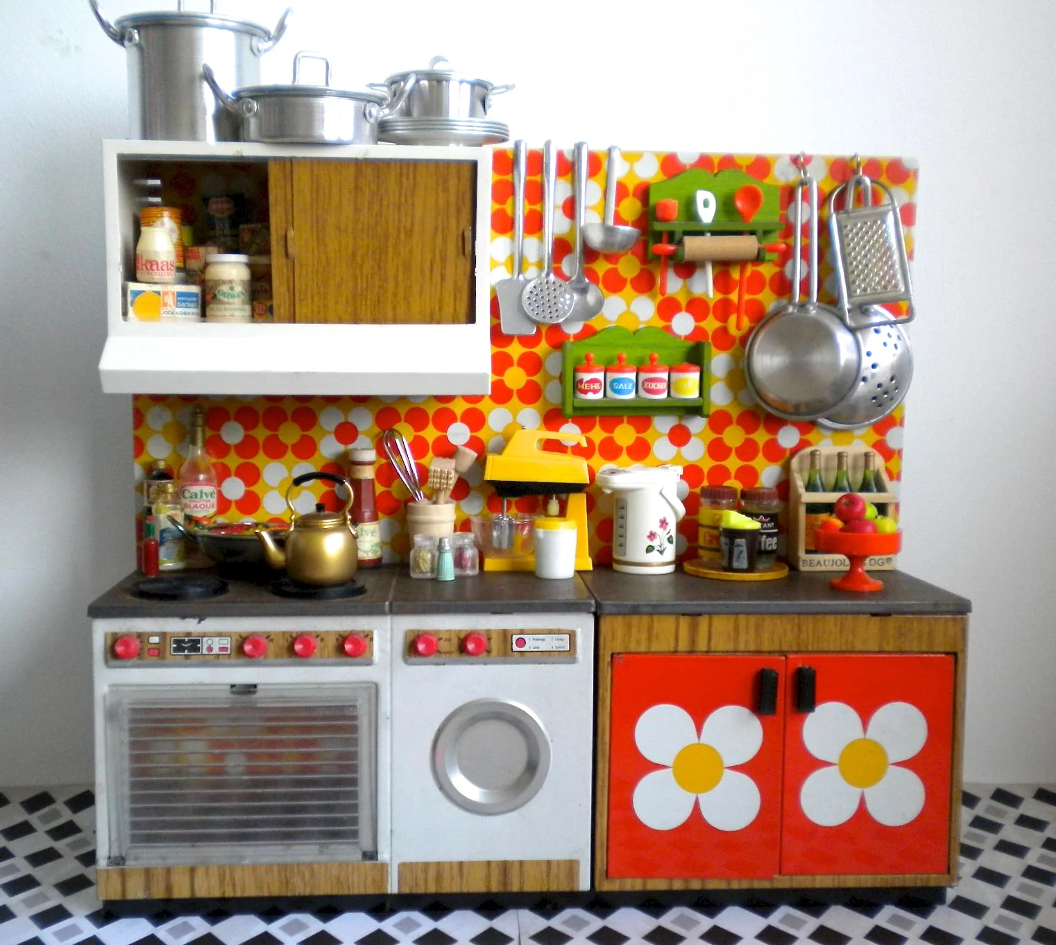 Here are some really nice tin litho kitchen toys from the 50s and thereabouts. They look great hung on a wall or on a shelf next to your fabulous book collection. There are some awesome sets available on eBay and Etsy. I just broke down and bought the first one below. Sorry! Can't resist an orange kitchen.